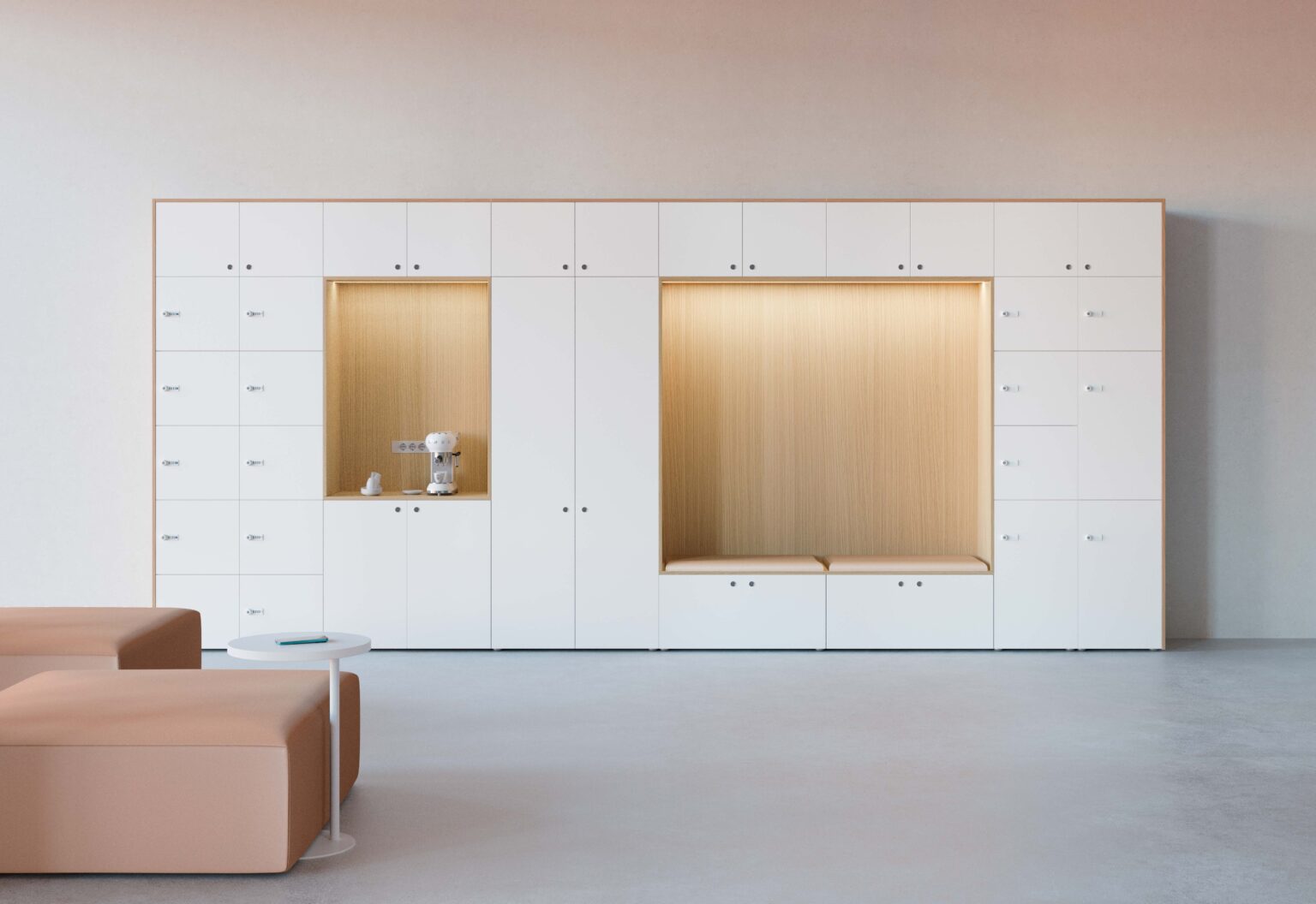 Un sistema a parete pensato per organizzare e attivare lo spazio. I contenitori e i lockers, disponibili in varie dimensioni e liberamente combinabili, danno vita a composizioni sempre diverse, capaci di adattarsi a contesti e funzioni differenti. Dall’ingresso alle aree di servizio, fino agli spazi informali come il coffee break, il sistema integra contenimento e utilizzo quotidiano, arricchendo l’ambiente di nuove possibilità operative e relazionali.