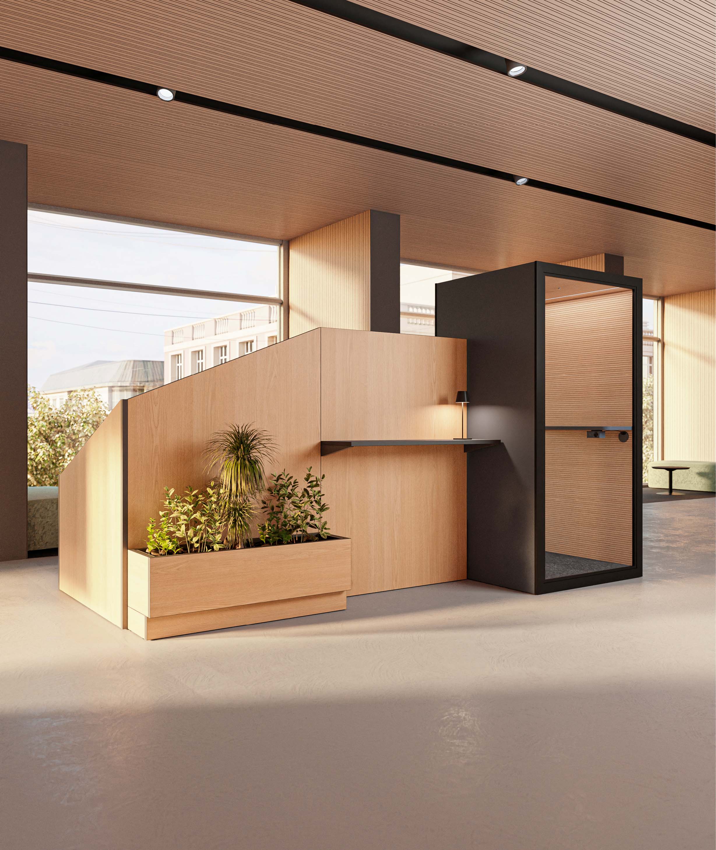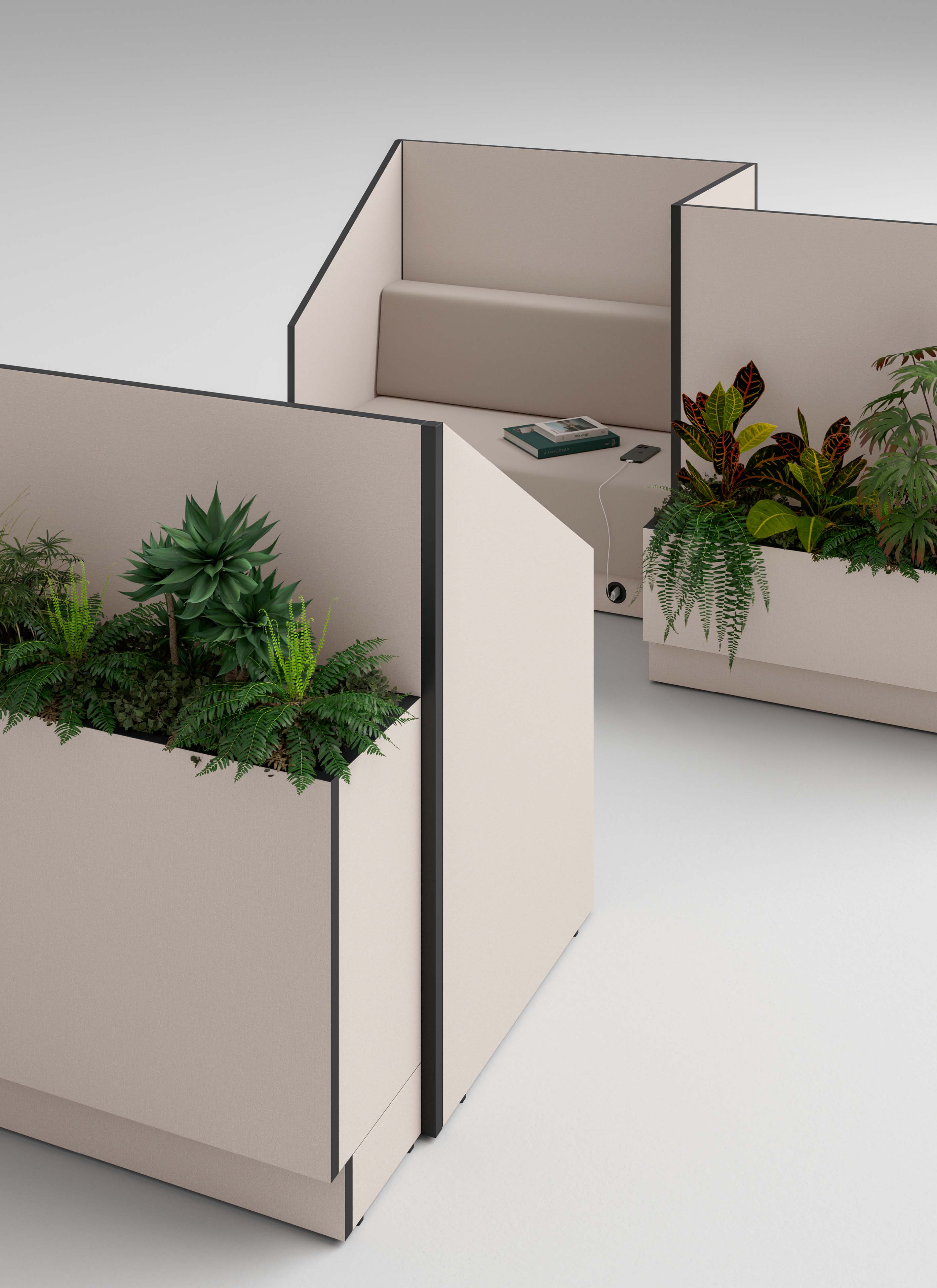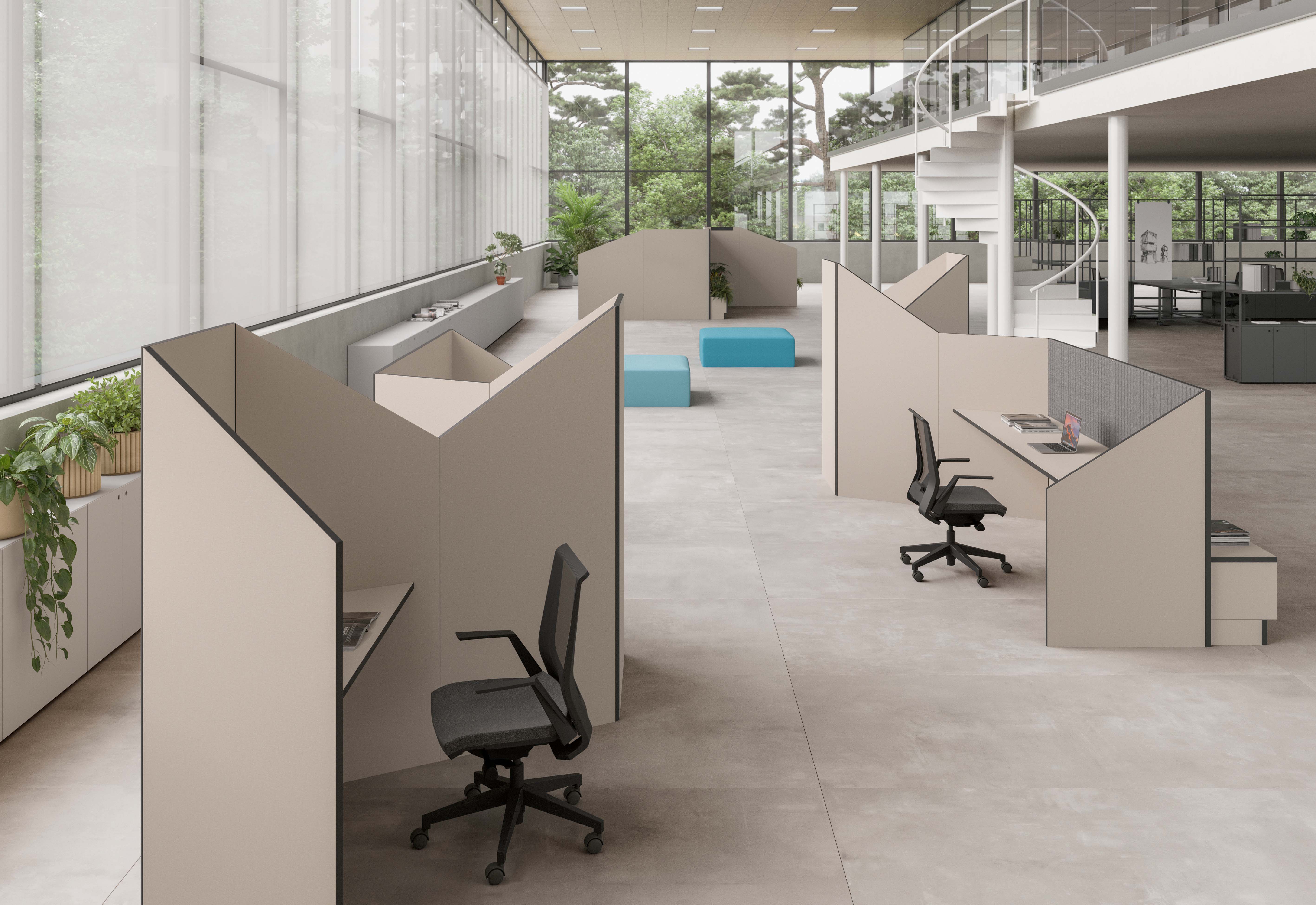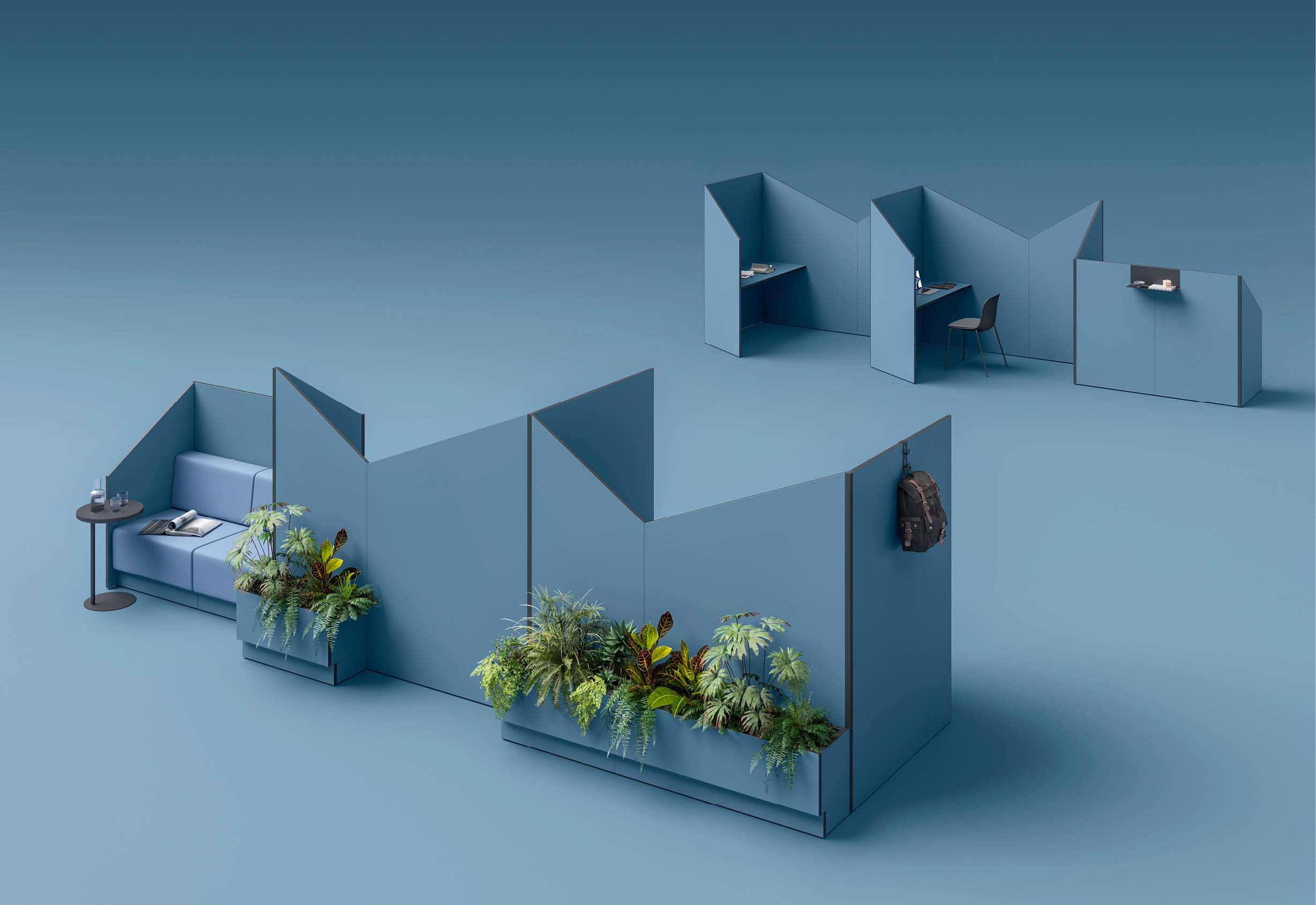 Queste composizioni definiscono spazi privati per momenti di focus brevi o lunghi, si integrano con i phone booth Mini per videochiamate individuali, creano sale meeting per lavoro in team e lavoro individuale. Le diverse altezze disegnano diversi livelli di privacy attorno ai quali si formano layout specifici e accoglienti per un landscape umano-centrico.